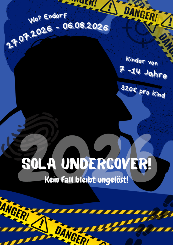 Vom 27.07.2026 bis zum 06.08.2026 starten wir gemeinsam in ein aufregendes Sommerlager voller Spannung und Abenteuer. Als geheime Ermittler begeben wir uns auf Spurensuche, sammeln Hinweise und decken mysteriöse Rätsel auf. Zusammen stellen wir uns jeder Herausforderung – denn bei uns gilt: SOLA UNDERCOVER -Kein Fall bleibt ungelöst!
